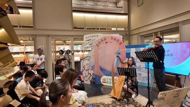 活动伊始,当来自小花园居民区的小提琴演奏家郑天华、青年竖琴演奏家夏淡一登上舞台,百新书局瞬时化身充满爱与旋律的慈善艺术空间。郑天华曾担任中国青年爱乐乐团首席,其琴声饱含深情与力量;夏淡一自幼习琴,本科毕业于世界顶尖音乐学府美国柯蒂斯音乐学院,指尖流淌着优雅与灵性。在本场活动中,两位“邻里艺术家”作为“社区一分子”进行公益表演,使得亲子艺术慈善日的艺术、温情指数拉满。演奏完毕,听众们热烈鼓掌,感慨地说:“当小提琴遇见书店穹顶,当竖琴的优雅与公益一同化作旋律流淌,这就是‘城市之心’独有的‘立体慈善体验’!”